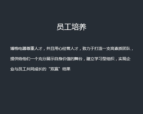 博格電器對(duì)人才的定義是具備高尚的職業(yè)道德,優(yōu)秀的專(zhuān)業(yè)素質(zhì),認(rèn)同博格電器企業(yè)文化,有危機(jī)感、責(zé)任感和使命感,有創(chuàng)新精神和持續(xù)改進(jìn)的主動(dòng)性,能夠誠(chéng)信、務(wù)實(shí)、協(xié)作、雙贏、忠誠(chéng),這就是博格電器吸納和培養(yǎng)的人才。